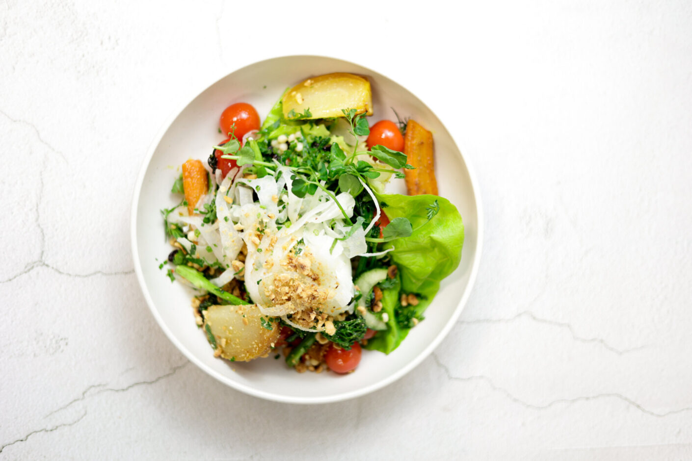 Deze salade zet verse groenten in de schijnwerpers. Hoewel het gerecht er eenvoudig uitziet, spelen wortels, uien, komkommer, bieten, broccoli en tomaat allemaal een centrale rol binnen de Hutten food chain. Samen met couscous (off-chain), rijk aan plantaardige eiwitten, en een notencrunch vormen zij een perfect geheel.