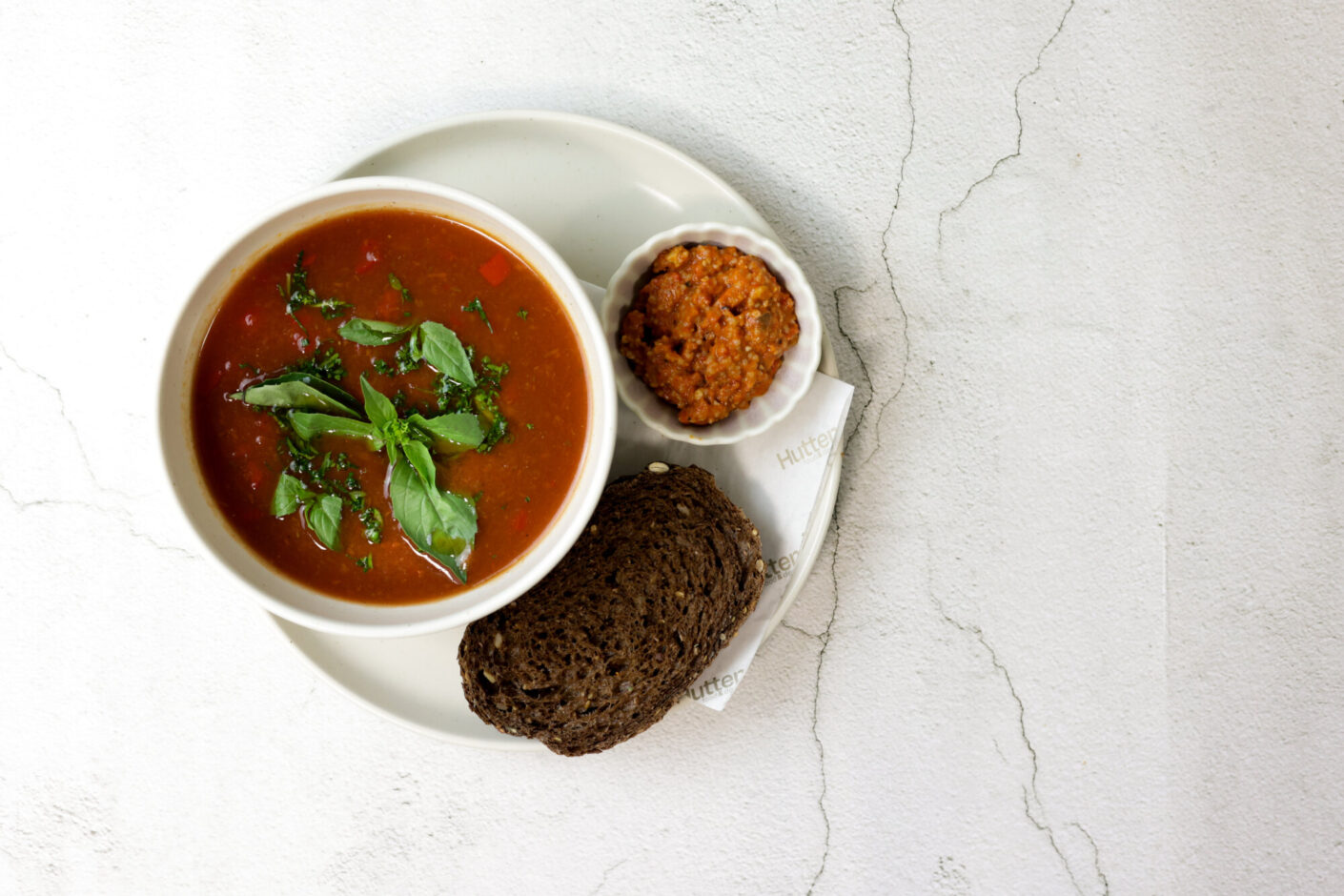 Tomatensoep is een van onze populairste soepen en wordt altijd geserveerd met onze huisgemaakte muhammara. Weten waar onze tomaten en paprika’s vandaan komen is een statement. Deze kom vertegenwoordigt de Hutten food chain en zit boordevol plantaardige eiwitten. Tomaten, knoflook, uien, paprika’s en balancerende kruiden, samen met heerlijk Nederlands volkorenbrood, zijn allemaal hoofdrolspelers binnen de food chain.